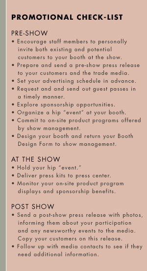 - Take advantage of advertising programs offered by show management in the show publications; like the Directories and Show Dailies.